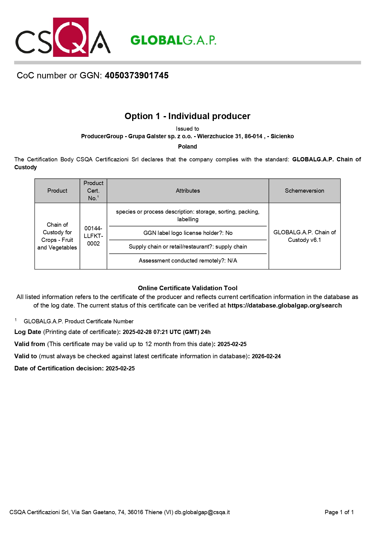 Część produkcyjna zakładu, chłodnie, sortownie oraz transport spełniają wymogi HACCP, a większość dostawców posiada w swoich gospodarstwach certyfikat Integrowanej Produkcji.